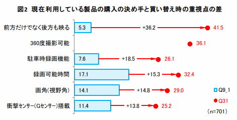 上記の図2はドライブレコーダー保有者(701名)を調査対象としたアンケート結果で、現在利用している製品の購入の「決め手」と買い替え時の「重視点」の差。決め手と重視点の差が実際に製品を利用した後で必要だと気付いたニーズの高い項目と言えるだろう。