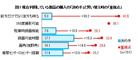 下図はドライブレコーダー保有者(701名)を対象としたアンケート調査結果で、現在利用している製品の購入の「決め手」と、買い替え時の「重視点」の差、つまり現在利用している製品の購入時には気にしていなかったが、実際に使ってみた後に、その必要性に気付いた機能となります。