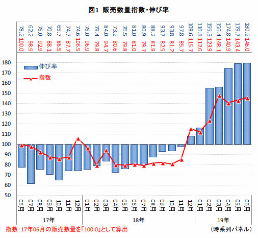ここ2年におけるメモリ市場の「数量伸び率」と、17年6月の販売量を100.0とした「数量指数」をみると、前者は18年12月から好転してプラスで推移、後者も伸び率に連動するかたちで数値を高めている(図1)。この要因を調べてみると、1GB当たりの単価(GB単価)が大きく影響を及ぼしていることが分かる。例えば、17年6月を境にGB単価が1000円台に上昇した時期があるが、このとき市場は急速に縮小へと転じている。単価アップが消費者の購買意欲を削ぐ動きとなったわけだ。その後、18年春ごろからGB単価の下落とともにマイナス幅は改善し、単価が1000円を下回った18年12月以降、一気に回復へと転じている。売れ行きの変動はGB単価に起因しており、ここ数カ月は業界にとっては追い風となっている。直近の動きをみると、19年6月の伸び率は180.2%と市場規模は前年同月の2倍近くにも達し、指数でも146.0と2年前の約1.5倍となった。