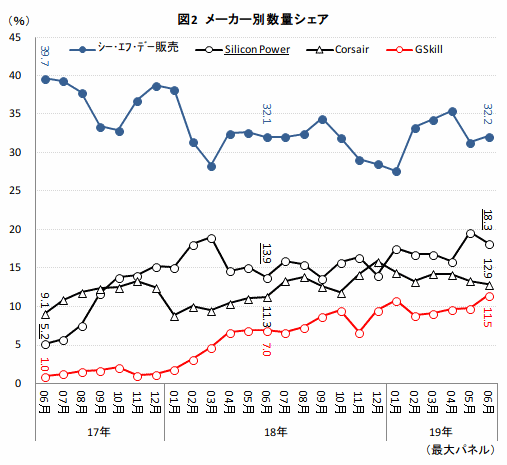 この2年間、首位の座を維持するのはシー・エフ・デー販売だ。17年6月に39.7%と4割近くを占有し、19年6月現在は32.2%と、この2年で7ポイント下げたとはいえ唯一3割台を維持する。シー・エフ・デー販売がやや停滞する中、2番手集団を形成するSilicon Power、Corsair、GSkillの3社の勢いは増しつつある。各社のシェアをみると、Silicon Powerは2年前の5.2%から、現在は18.3%に躍進。同様にGSkillは1.0%から11.5%へ、Corsairは9.1%から12.9%へとシェアを高めており、シー・エフ・デー販売を着実に追い上げる動きとなっている。この上位4社のシェアを合計すると、2年前は55.0%だったが、現在は74.9%と寡占化が進んでいることも明らかとなった。