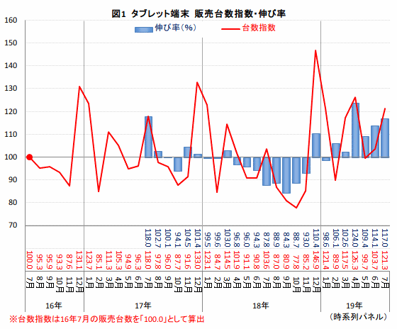 タブレット端末市場は2018年10月を底に回復へと転じ、19年2月以降は前年を上回る売れ行きとなっていることが、家電量販店・ネットショップの実売データを集計する「BCNランキング」から明らかになった。特に6月、7月はタブレット端末だけでなく、ノートPC、デスクトップPCも伸び率(前年同月比)はプラスで推移しており、Windows 7のサポート終了に伴う需要増が顕在化している。