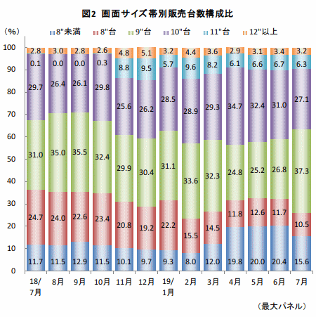 タブレット端末はアップルのシェアが高いこともあり、iPadの新製品の影響を大きく受けることは否定できない。それまでは1%にも満たなかった「11"台」の台数比率が18年11月には8.8%へと大きく高まったのは、11インチのiPad Pro発売が最大の要因だ(図2)。また、先にも指摘したように19年3月末の第5世代iPad mini発売で、1ケタ台にまで落ち込んでいた「8"未満」の比率が5月には2割へと回復。19年7月には第6世代iPad 9.7"が売れ筋の上位を独占したことで、このゾーンの比率は4割近くを占め、「9"台」がボリュームゾーンとなった。初代iPadから市場をけん引してきた9.7"の端末が、PCの代替として選ばれていると言える。