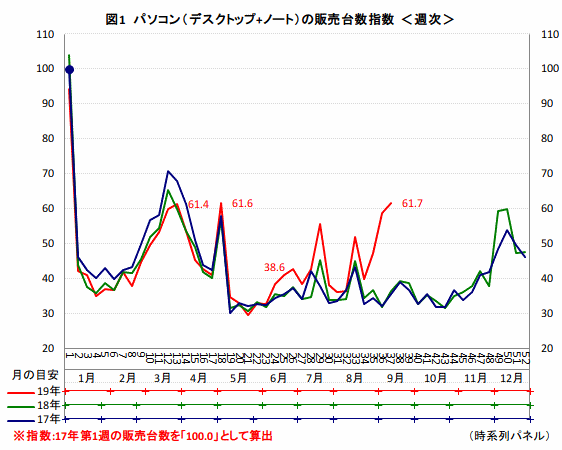 17年1月第1週のパソコン全体の販売台数を「100.0」とした指数をもとに、週の動きを見ていく(図1)。一年間の台数指数の動きは、12月の年末商戦から市場は拡大し、年をまたいだ1月第1週の年始商戦でピークを迎える。この年末年始以外では、年度末の3月、ゴールデンウィークを含む5月第1週にも市場は拡大しており、季節変動が読み取れる。しかし、19年は前年、前々年とは異なる動きがあらわれた。6月第2週以降の指数は過去2年を上回り、直近の9月第1週では61.7を記録。年度末商戦(3月第4週)の61.4やゴールデンウィーク(5月第1週)の61.6を超えていることが分かった。