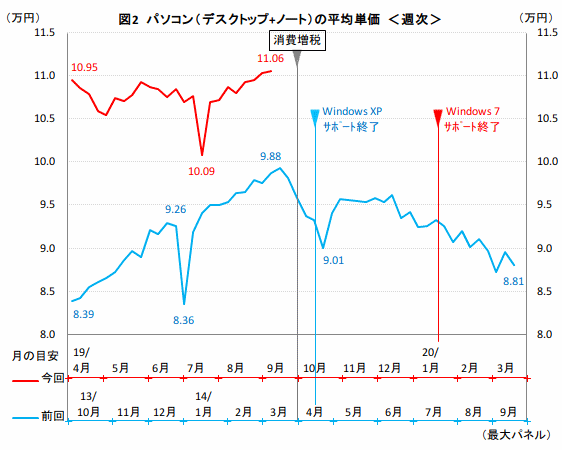 デスクトップPCとノートPCを合わせたパソコン市場は、2019年10月の消費増税や20年1月のWindows 7サポート終了に向けた駆け込み需要の始まりが、家電量販店・ネットショップの実売データを集計する「BCNランキング」から明らかとなった。過去3年の販売台数を週単位で比較して、いつから需要が高まっているのか。また、消費増税前後の平均単価の動きを前回の増税時と比較した。
