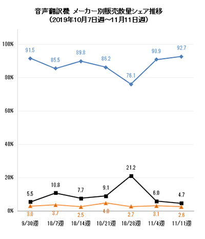 新型の発表と、それに伴う旧型の値下げの影響か、10/7週以降は9割を割っていたメーカー別シェアが再び9割を超えた。