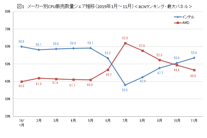 全国の主要家電量販店やネットショップのPOSデータを集計する「BCNランキング」の2019年1月から11月までのCPUのメーカー別販売数量シェアをみると、19年1月は40.0%だったAMDのシェアは7月に大きく伸び62.0%を記録した。インテルのCPU供給力不足に加え、AMDのRyzen5や7の新製品が発売されたことが主な要因だ。