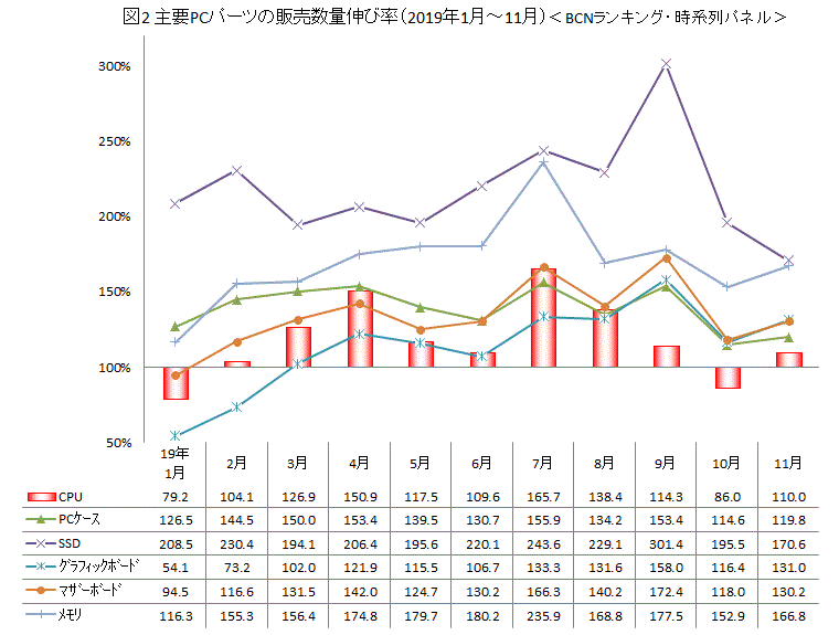 こうしたCPU市場の活況は他のPCパーツの販売にも良い影響を及ぼしていることがわかった。同期間における主要PCパーツの販売数量伸び率(前年同月比)をみると、3月から全ての主要PCパーツでプラスに転じ、7月には更に大きく動いたことを示している。新たなCPUの発売によりPCパーツ市場の活性化が促されたとみることができるだろう。