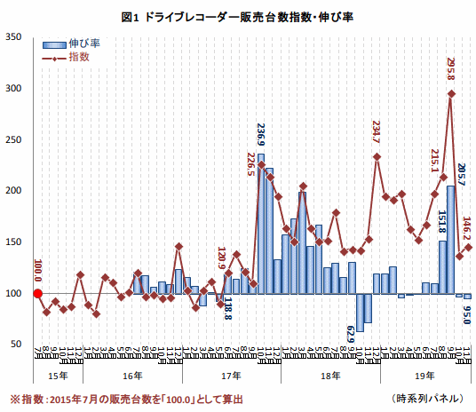 BCNが集計し始めた2015年7月の販売台数を「100.0」としたドライブレコーダーの指数をみていくと、17年までは3月、7月、12月に販売台数が増加する季節変動が現われた(図1)。しかし、17年10月に指数が226.5、伸び率(前年同月比)は236.9%と大きく動いた。この要因は、同年7月に発生した東名あおり運転事故の加害者の逮捕が、3カ月後の10月に大々的に報道されたためだ。その後一年にわたり、指数は高い水準を維持したものの、伸び率では18年10月と11月に反動減でマイナスに転じた。また19年8月には、常磐道のあおり運転・殴打事件の報道により再び市場が大きく動き、指数は215.1、伸び率は151.8%と売れ行きは拡大した。その後は消費増税の駆け込み需要も加わり、指数では集計以来、最も高い値となる295.8を記録したが、需要の先食いにより直近の2カ月の伸び率は前年割れとなっている。