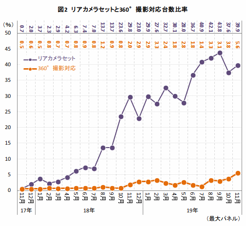 こうした結果から、リアカメラセット製品と一台で全方向を撮影できる360°撮影対応製品の販売台数比率を算出してみた(図2)。まず、リアカメラセットの比率をみると、18年8月に13.7%と1割を超え、その後右肩上がりとなった。19年6月以降は4割前後で推移している。一方、360°撮影対応の比率の動きは鈍く、19年11月にようやく5.6%と、かろうじて5%超えとなった程度で、リアカメラセットよりも市場規模は小さい。この背景には、平均単価との関係があるかもしれない。現状、ドライブレコーダー市場全体の平均単価は1万5000円前後だが、リアカメラセットは2万-2万5000円。一方の360°撮影対応は3万円を超えており、市場全体の倍以上と高め。この単価差が360°撮影対応製品が普及する上で支障になっていると言えそうだ。しかし、車両の前方・側面・後方に加えて車内も撮影できるメリットを訴求することで、この単価差は埋まる可能性はある。
