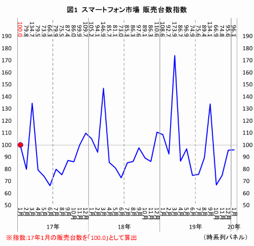 スマートフォン市場の販売台数指数を2017年1月を「100.0」として算出したところ、例年は6月を底に翌年の3月に向けて右肩上がりに推移していることが分かった(図1)。しかし、19年は10月の分離プラン義務化により、今までとは異なる動きがあらわれた。消費増税前の駆け込み需要が重なった19年9月の販売台数指数は「134.1」と17年同月の「87.4」や18年同月の「97.6」を大きく上回った。そうした反動もあり、19年10月は「66.9」まで落ち込み、それ以降は低調な推移となっている。17年と18年は年末年始で起点を超える動きをみせたが、19年はそれほどの力強い動きはみられず、指数は100に届かず、95~96程度にとどまっている。