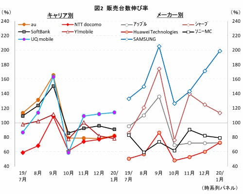 そこで、どのキャリアやメーカーが影響を受けているのか見ていくため、19年7月から20年1月までの7カ月間のそれぞれの販売台数伸び率(前年同月比)を算出した(図2)。