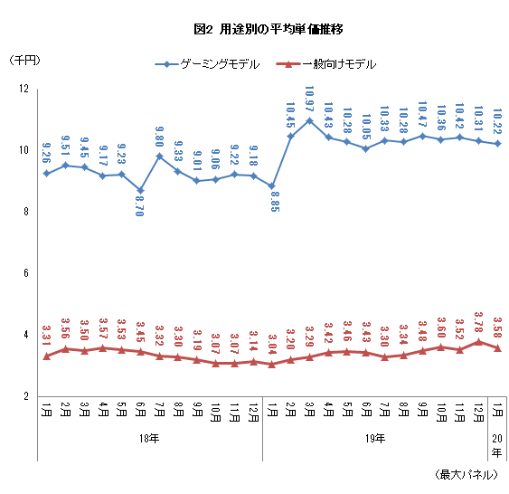 次に、キーボードを一般向けモデルとゲーミングモデルに分けて平均単価を比較してみた(図2)。18年1月の一般向けモデルは3310円であるのに対し、ゲーミングモデルは9260円と、およそ3倍の開きがある。一般向けモデルはここ2年間、3000円台で推移しているが、一方のゲーミングモデルは19年2月に1万円台に達し、以降1万円台を維持している。2月に1万円台に達した要因は、ロジクールの単価上昇や、Razerの2万円を超える新製品が発売になったことだ。ゲーミングキーボードは人気PCゲームタイトルの存在やeスポーツの盛り上がりを受け、販売数が伸びていると思われる。