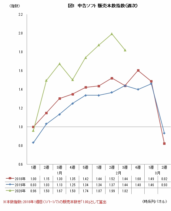 18年1月1週(1/1-1/7)の販売本数を「1.00」として、直近3年の1月-3月の指数を算出した(図1)。例年、申告ソフトは1月から販売本数が増加、申告締切の直前となる2月4週もしくは3月1週にピークを迎える。18年は2月4週(2/26-3/4)に「1.60」、19年は3月1週(3/4-3/10)に「1.46」と最も高い指数を記録した。20年はWindows 7 EOS直前の1月2週(1/6-1/12)に「1.50」、翌3週(1/13-1/19)には「1.67」と旺盛な動きになった。2月2週では「1.99」と現状20年で最も高い指数となり、最新週となる翌3週でも「1.82」と高い指数をキープしている。
