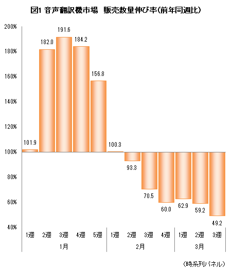 2020年の1月1週(2019/12/30-2020/1/5)から3月3週(2020/3/16-3/22)までの販売数量伸び率(前年同週比)をみていく(図1)。民放の番組でソースネクストの「ポケトーク」が取り上げられた翌週20年1月3週に伸び率は前年を大きく上回る191.6%にまで達した。しかし、新型コロナウイルスの流行拡大に伴い、2月に入ると潮目が変わった。2月2週に93.3%と前年割れに転じた後、直近の3月3週では49.2%まで落ち込み、前年の5割にも満たないことが家電量販店・ネットショップの実売データを集計する「BCNランキング」から明らかになった。