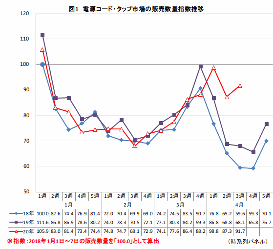 年末年始と年度末(特に3月最終週)に、電源タップ・コード市場は販売数量が増加する。しかし、2020年は新年度に入っても、年度末とほぼ同水準の販売数量を維持している。