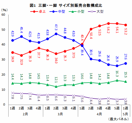 三脚・一脚は撮影機器を固定することで手ぶれを防止し、写真や動画を撮影するために使われる機材だ。三脚・一脚のサイズごとに卓上(全高0.5m未満)、小型(同1.0m未満)、中型(同1.7m未満)、大型(同1.7m以上)と定義し、販売台数構成比を算出したところ、4月2週から卓上サイズの構成比が過半数を占めていることが分かった(図1)。これは1都1府5県に緊急事態宣言が発令となった4月7日を含む時期と重なっている。