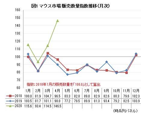 新型コロナウイルス感染症の流行により、在宅勤務が推奨されている。緊急事態宣言が発令され、より在宅勤務への移行が進んだ4月のマウス・キーボード市場に例年と異なる動きがみられた。