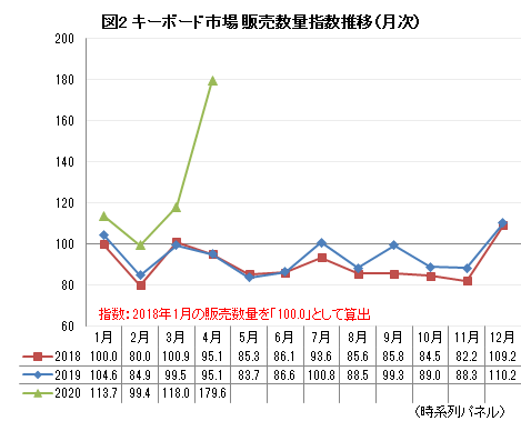 マウス・キーボードそれぞれの2018年1月の販売数量を「100.0」とした指数をみていく(図1・図2)。直近2年の動きをみると、年末年始と年度末に指数が高まるという動きをしていることがわかる。例年、4月は指数が減少に転じるが、20年は異なる動きが見られた。新型コロナウイルス感染症の流行により、在宅勤務が推奨された影響から、マウスでは「146.5」、キーボードで「179.6」と、直近2年間で最も指数が高まったことが家電量販店・ネットショップの実売データを集計する「BCNランキング」から明らかになった。