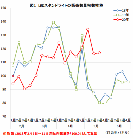 18年2月1週(2/5-2/11)の販売数量を「100.0」とし、2月から6月まで、ここ3年間のLEDスタンドライトの販売数量指数を算出した(図1)。20年の販売数量指数は過去2年の季節変動とは異なる動きを示していることが分かった。新型コロナウイルスの感染拡大により、3月2週から4月1週にかけての新生活需要は盛り上がりに欠けた。例年はゴールデンウィーク前に一度販売は減少するが、20年はそうした動きは見られなかった。在宅勤務やリモート授業など、屋内で仕事や勉強をするため、照明器具の需要が増えたことが要因と考えられる。また、web会議などで、LEDスタンドライトが簡易照明として使えることも販売を押し上げた理由の一つといえそうだ。今年は5月に入ってもまだ高い水準で推移している。