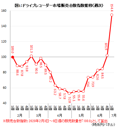 2020年2月1週(2月3日-2月9日)の販売台数を「100.0」とした、ドライブレコーダー市場の台数指数を直近の7月1週までみていく(図1)。2月・3月の販売台数指数は80~100の間で推移していたが、緊急事態宣言が全都道府県に拡大されたことを機に、台数指数は基準の半分程度まで落ち込んだ。しかし、5月4週に緊急事態宣言が解除になると指数は70まで回復。その後、6月30日に施行された改正道路交通法に関連するニュースが、ドライブレコーダーの映像とともに取り上げられたことで市場は急速に回復し、直近の7月1週は「154.4」に達した。