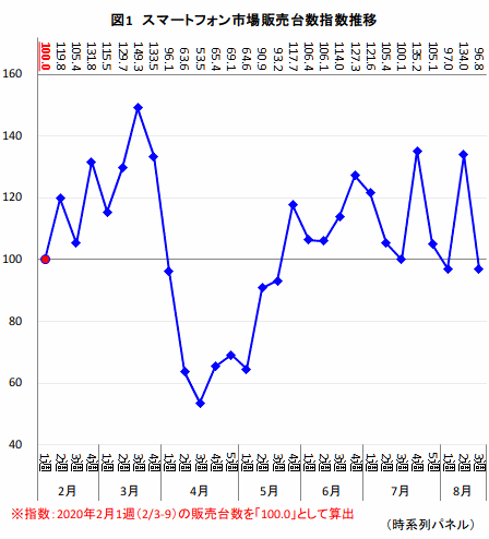 5月11日に3キャリアから「iPhone SE(2nd)」が発売になると、台数指数も5月2週(5/11-5/17)に90.9、翌5月3週(5/18-5/24)は93.2まで回復。加えて、5月25日に緊急事態宣言が全国で解除になったことをきっかけに、5月4週(5/25-5/31)の台数指数は101.9と9週ぶりに基点を上回った。以降、週により振れ幅は大きいものの、台数指数は基点を超える週が多く、2月とほぼ同等の水準で推移している。