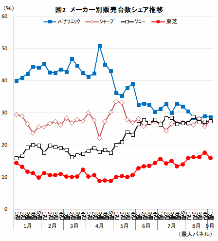 1月から4月まで4割を占め首位を維持していたパナソニックだが、5月からの単価上昇をきっかけに3割台まで低下、8月に入ると3割を維持するのも困難な状況になっている(図2)。代わりにソニーがシェアを上げており、6月にはシャープを捉え、2位争いを展開していた。8月2週にはパナソニックを抜き、僅差の首位になったが、翌8月3週はシャープとパナソニックが同率の首位になるなど、この3社による首位争いは激しさを増している。