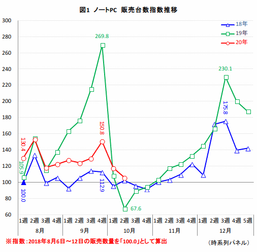 ノートPC市場の18年8月1週(8/6-12)を「100.0」とした、直近の3年間分の販売台数指数を算出した(図1)。18年を例にとると、8月2週のお盆時期に需要は高まるが、以後12月1週までほぼフラットで推移し、12月2週から3週にかけて年末商戦という動きを示した。しかし、19年は10月の消費増税に向け、8月4週から徐々に駆け込み需要が発生、9月4週は269.8とピークに達した。当然のことながら翌10月1週には反動減が現われ、翌2週には67.6。ピーク時の指数と比較すると、実に200ポイント以上も急降下したことが分かった。20年は18年同様の動きをみせており、異常な動きをした19年との比較では、前年を大きく下回る結果となってしまった。