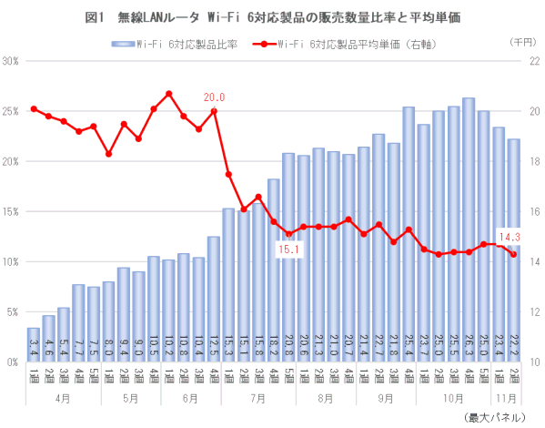 - ・無線LANルータ Wi-Fi 6対応製品の販売数量比率と平均単価推移