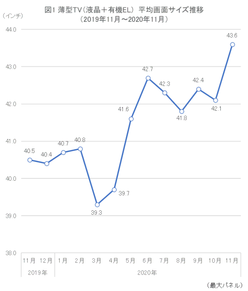 薄型テレビの平均画面サイズを、19年11月から20年11月の期間でみていく(図1)。19年11月から20年2月までの平均画面サイズは40インチ台で推移していたが、新生活需要期には小型テレビの販売が増加するため、3月、4月は39.3、39.7と、40インチを下回った。再び大画面化は進行し、6月に42.7に達した後、42インチ前後で推移していたが、11月には過去最高の43.6を記録した。