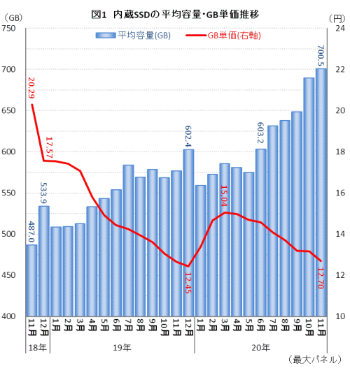 直近2年間における内蔵SSDの平均容量をみると、2年前の18年11月時点では487.0GBだったが、翌12月には533.9GBと500GBを超えた(図1)。19年は年間を通じて500GB台で推移し、年末になって602.4GBに達したものの、20年の年初から再び500GB台まで落ち込む。20年6月には603.2GBと600GBを超えた後、月を追うごとに平均容量は右肩上がりで推移、11月には700.5GBに達した。