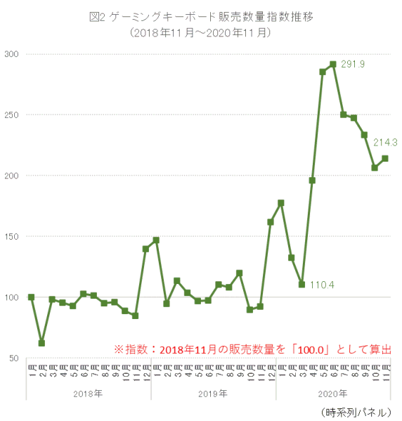 ゲーミングマウス、ゲーミングキーボードそれぞれ2018年11月の販売数量を「100.0」とした指数をみていく(図1・図2)。18年・19年は2アイテムとも商戦期にあたる年末年始を除き、100前後の指数で推移していたが、20年3月以降状況は一変した。新型コロナウイルス感染症流行に伴う外出自粛から、自宅でゲームをする人が増加したと考えられる。3月から6月にかけて指数が急上昇し、ゲーミングマウスは「245.8」、ゲーミングキーボードは「291.9」とそれぞれ6月にピークを迎えた。11月時点では、指数はやや落ち着いているものの、引き続き18年1月の2倍の規模で推移している。