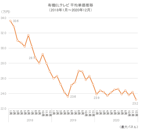 18年1月に33万6000円だった有機ELテレビの平均単価。8月に28万7000円と初めて30万円を下回ると、19年5月の23万6000円までほぼ月を追うごとに下落していった。その後25~27万円まで上昇する場面はあったが、20年1月には再び23万円台に下がった。以降、23~24万円台で推移し12月には過去3年で最も安い23万2000円を記録した。