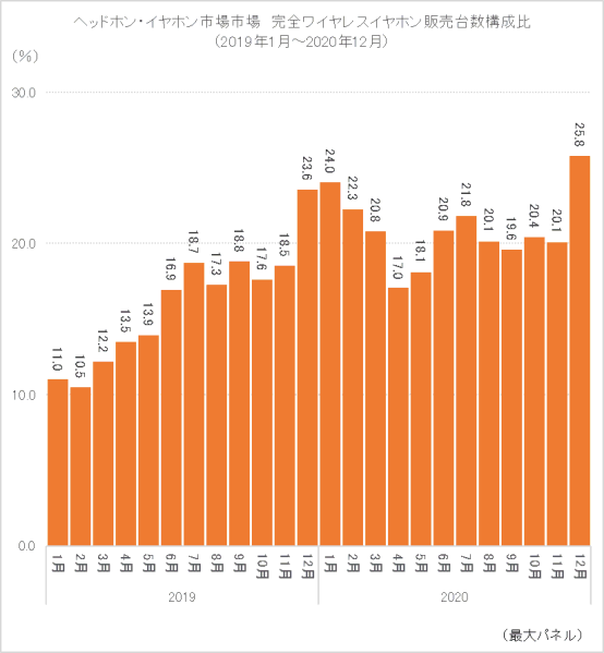 2019年、3月にアップルが「AirPods」シリーズの第2世代製品を発売。ソニーやBeats Electronicsなども新製品を投入したことで、1月時点で11.0%だった完全ワイヤレス比率が7月には18.7%まで高まった。さらに10月の「AirPods Pro」発売がきっかけで、年末商戦ピークの12月には初めて構成比が2割を超えた。20年に入ると20%前後で推移するようになり12月に過去最高の25.8%に達した。「AirPods Pro」の販売数が大幅に増加したことに加え、アップルに次ぐシェアを持つソニーやBOSEの新製品も構成比を押し上げた。