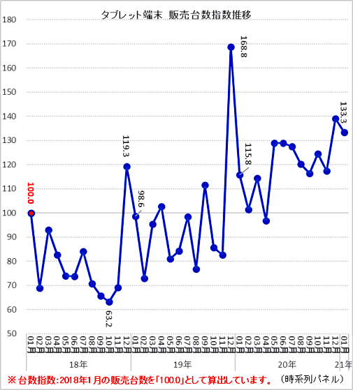 20年はHuawei Technologiesに対するアメリカの制裁が一層厳しさを増したが、同年4月以降は新型コロナウイルスの感染拡大による在宅勤務やリモート授業、巣ごもり需要により、市場規模の拡大スピードは更に増している。20年1月の「115.8」に対し、21年1月は「133.3」を記録しており、昨年を上回る水準でのスタートとなった。