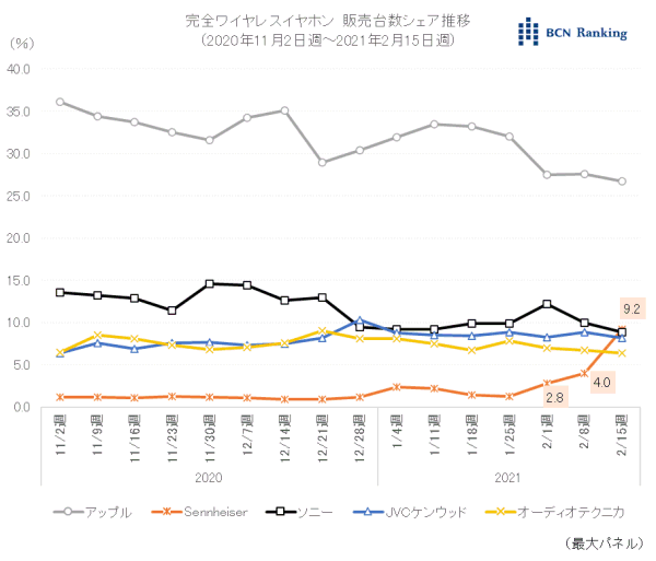 20年11月2日週から21年2月15日週までは、アップルが3割前後のシェアで独走する一方、ソニー、JVCケンウッド、オーディオテクニカの3社で2位争いを繰り広げていた。ゼンハイザーのシェアに変化が起きたのは2月8日週。前週から1.2ポイント上昇し4.0%と2位集団に急接近した。翌2月15日週には過去最高の9.2%を記録、3社を抜き去り2位に躍り出た。急上昇の要因は、同社が現在実施している「新生活応援セール」。「CX 400BT」シリーズを約4割引で販売することで、売り上げを大幅に伸ばしている。
