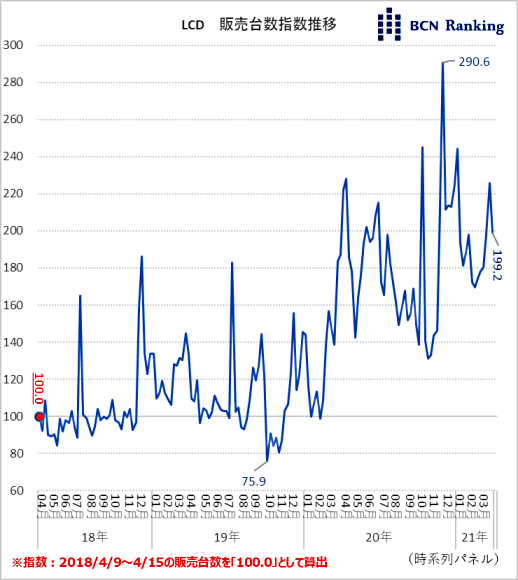 LCD市場の直近3年間の台数指数の推移を振り返る。2018年の年末から翌19年3月ごろまで緩やかなに右肩上がりで推移、19年10月1週の消費増税により一時的に指数は「75.1」まで落ち込んだ。しかし年末商戦を迎えて急速に回復、20年1月はWindows7サポート終了に伴うPCの買い替え特需の恩恵を受けた。3月-4月にかけては、コロナ感染拡大による在宅勤務やリモート授業の拡大で需要が増加し市場規模は大きくなった。