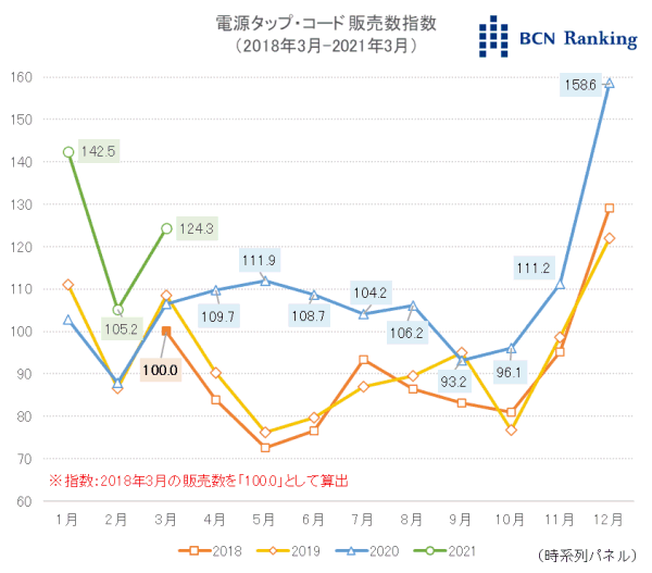 2018年3月の販売数を「100」とした電源タップ・コード市場の販売数指数を算出したところ、20年4月以降、例年よりも2割から5割の水準で売り上げが増加した。要因は新型コロナウイルスの影響で自宅時間が増えたためだ。9月、10月はやや指数を下げたが、11月には再び「111.2」まで上昇。12月は過去3年で最高の「158.6」を記録した。21年に入っても勢いは続いており、直近3月の指数は「124.3」。この3年で市場規模は1.2倍に拡大した。