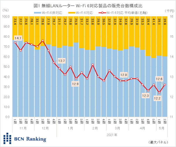 無線LANルータ市場で、最新規格のWi-Fi 6に対応した製品が販売台数の4割に達した。家電量販店・ネットショップの実売データを集計する「BCNランキング」から明らかになった。