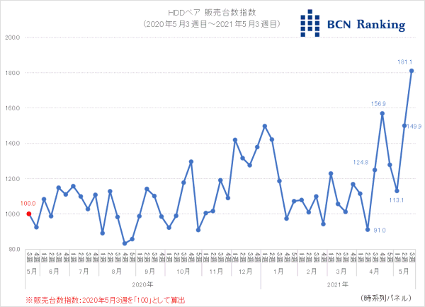 2020年5月3週の販売台数を「100」としたHDDベアの販売台数指数は、4月4週に「156.9」、5月3週には「181.8」と直近1年で最も高い指数を記録した。通常、HDDベアは12月・1月が需要期で、4月・5月に指数がここまで高まるのは例年にない動きだ。
