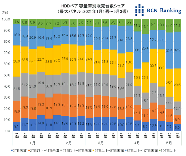 市場では6TB以上と大容量製品の占める割合が増加している。4月3週に8TB-10TB未満の割合が初めて30%を突破、5月2週以降も32%以上を占めている。また、6TB-8TB未満の割合も増加しており、4月4週に26.9%になると、翌週からは30%を超え、5月1週には33.2%まで上昇した。