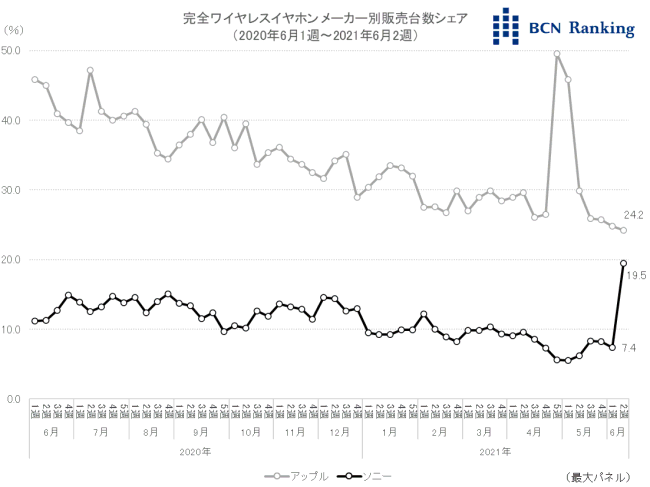 完全ワイヤレスイヤホン(TWS)市場でソニーのメーカー別販売台数シェアが急伸、アップルに4.7ポイント差まで迫っている。家電量販店・ネットショップの実売データを集計する「BCNランキング」から明らかになった。