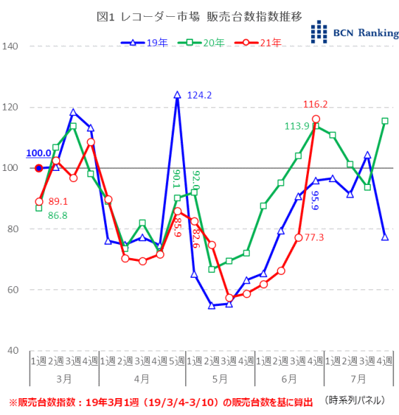 レコーダー市場の3月-7月までの3年間の指数を、2019年3月1週(3/4-3/10)の販売台数を基に算出した。例年3月は年度末商戦により、販売台数指数は上昇する。また、ゴールデンウィークを含む週も指数は動く時期で、19年は4/27-5/6までの10連休であったため4月5週(4/29-5/5)に集中し、指数は124.2を記録した。一方、20年と21年は連休が前半と後半に分散したことから、指数も2週に分散している。