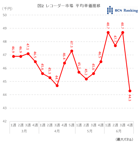 家電量販店・ネットショップの実売データを集計する「BCNランキング」で、レコーダー市場において、6月4週(6/21-6/27)の販売台数が急増していることが明らかとなった。今後も前週の水準を維持するようであれば、五輪特需と言えそうだ。