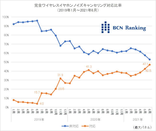 21年6月に販売されたTWSのうち、ノイズキャンセリング対応製品の販売数構成比は47.1%と過去最高を記録した。19年1月時点は10%にも満たなかったが、7月にソニーが「WF-1000XM3」を発売したことで11.7ポイント増の15.7%を記録。10月にはアップルが「AirPods Pro」を発売したことで20%を超え、11月には31.9%まで上昇した。20年になると、パナソニックやゼンハイザーなどのメーカーも対応製品を発売し始め、市場は更に盛り上がりを見せた。5月には初めて40%を突破し、その後も4割前後で推移していた。
