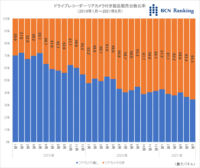 リアカメラ付きドライブレコーダーの販売台数構成比はこの6月、過去3年で最高の65.5%を記録した。19年1月時点ではリアカメラ付き製品の比率は29.9%と3割にも満たなかった。その後、同年8月に常磐自動車道でのあおり運転事件が発生したことや、10月の消費増税に伴う駆け込み購入の影響で9月には43.9%を記録。10月は反動で一旦比率が下がったものの、20年1月に初めて50%を突破した。6月にあおり運転の厳罰化を定めた改正道路交通法が施行されると、56.9%に上昇。以降、60%前後で推移していた。
