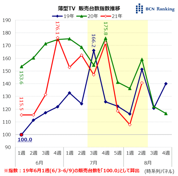 19年6月1週(6/3-6/9)の販売台数を「100.0」として、直近3年(19-21年)における6-8月の指数を算出したところ、夏のボーナス商戦にあたる19年7月3週は166.2を記録した。20年は特別給付金や巣ごもり需要によって、春ごろから高い水準で推移したこともあり、6月1週は153.6と高い出だしになっている。7月4週の夏のボーナス商戦では175.8と前年を上回った。21年は20年ほどの高い水準ではないものの、東京五輪前の6月4週には176.1に達したが、五輪期間中に失速。7月5週以降の3週間は19年の水準を下回り、今一つぱっとしない動きとなった。