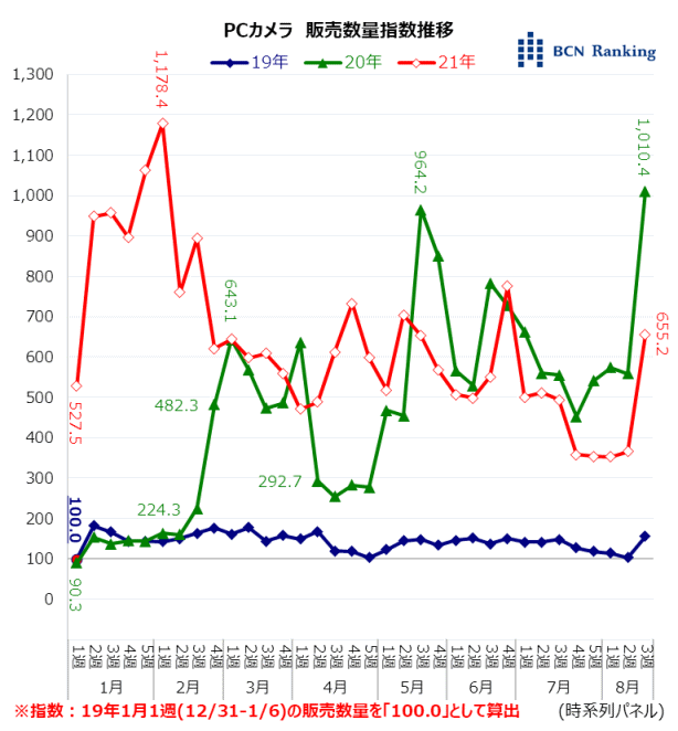 21年も年初早々から一都三県に緊急事態宣言が発令されたこともあり、2月1週に1178.4を記録。その後、指数は400-800の間で推移しており、21年に入ってもなお、PCカメラの需要は高い状態が続いていることが分かった。