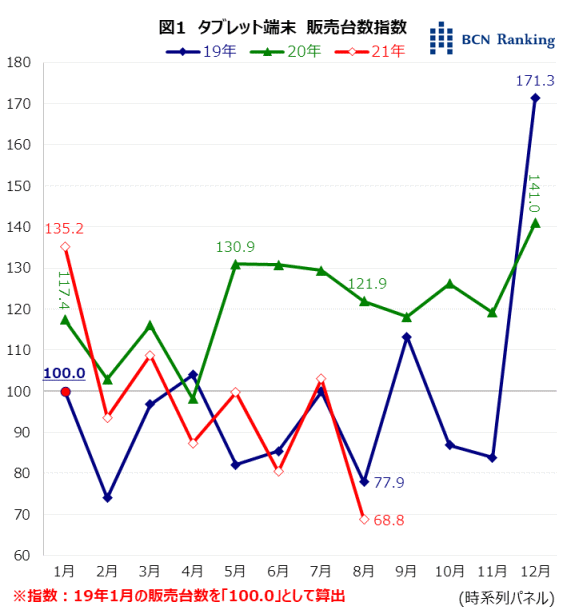 19年1月のタブレット端末市場を「100.0」とした販売台数指数の推移をみると、同年12月に171.3を記録、この3年で最も高い水準に達した。これはアップルの販売台数が大きく伸びたことが要因だ。また、20年5月以降はコロナ禍により需要が増加し、その後21年1月まで高い水準を維持したことも分かる。