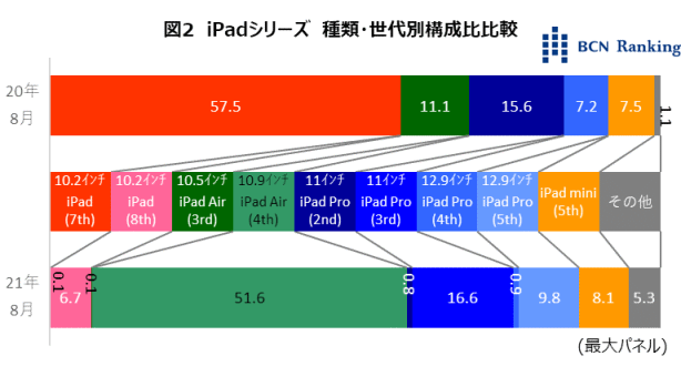 同市場のシェアではアップルが過半を占めており、良くも悪くもアップルの販売が市場規模を左右する。一方、メーカーシェア上位3社の前年同月比では、アップルは5割に達せず、レノボ・ジャパンは2ケタ増、NECはほぼ前年並みといった具合だ。アップルが前年を大きく下回っている原因を探るため、20年と21年の8月におけるiPadシリーズごとに比率を算出してみたところ、大きな変化があらわれた。