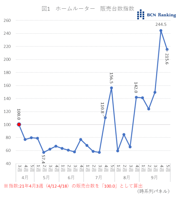ホームルーターは、2014年12月にSoftBankBB(当時)が提供を開始するが、市場として拡大し始めたのは、UQコミュニケーションズがSpeed Wi-Fi HOMEの製品を発売した17年に入ってからだ。21年4月第3週(4/12-4/18)の販売台数を「100.0」として指数を算出したところ、7月第4週(7/19-7/25)、第5週(7/26-8/1)に指数が100を一時的に超えた。docomoがHome 5Gサービスを開始した8月第4週(8/23-8/29)以降は恒常的に100を超え、9月第4週(9/20-9/26)に244.5、翌第5週(9/27-10/3)も215.6を記録し、約5カ月の間に市場規模は2倍以上に膨れ上がっている。